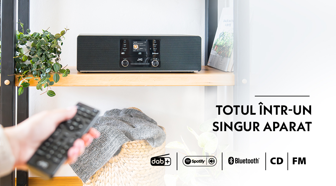Aveți playlisturile preferate fără de care nu vă puteți imagina o zi? Atunci ascultați! Sistemul audio suportă Spotify Connect, ceea ce înseamnă că puteți reda conținut din aplicație chiar prin acest dispozitiv JVC. Simplu, comod și fără a necesita alte conexiuni. Este suficient să selectați JVC RD-E984B ca dispozitiv de ieșire în aplicația Spotify, iar sunetul va începe să fie redat din difuzoarele sistemului. Între timp, puteți continua să folosiți telefonul – de exemplu, pentru a naviga prin playlisturi, mesaje sau rețele sociale.