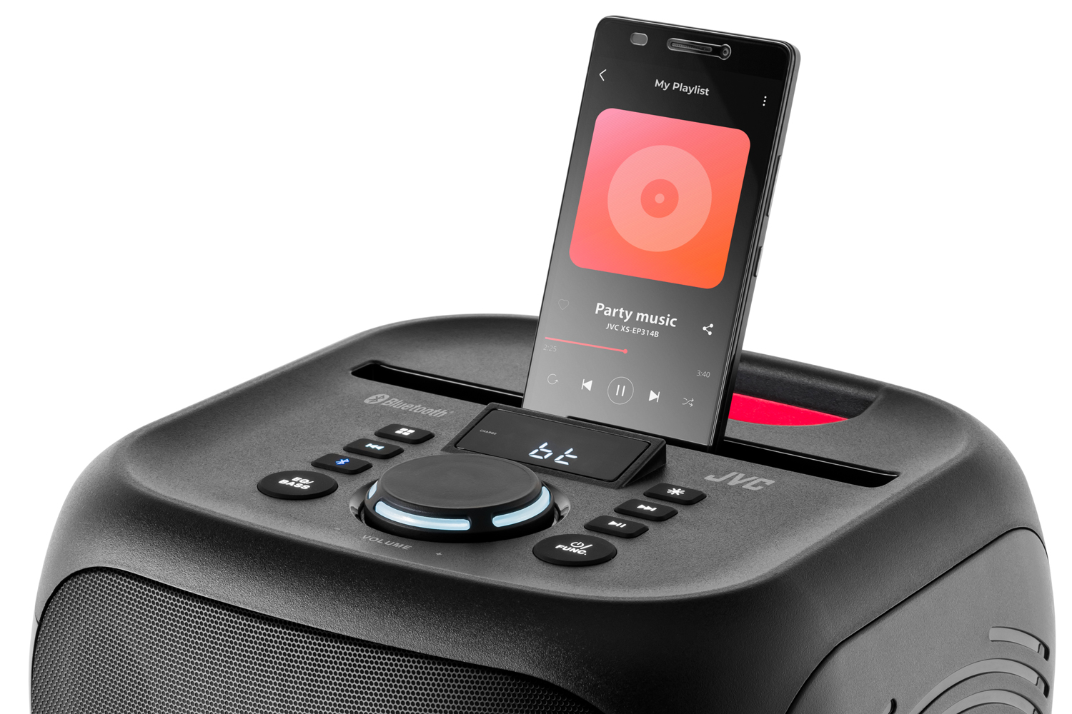 Noul difuzor de petrecere JVC XS-EP314B este echipat cu Bluetooth în versiunea 5.3. Datorită acestei tehnologii, poți reda ușor și convenabil piesele preferate de pe telefonul mobil, tabletă sau alte dispozitive.